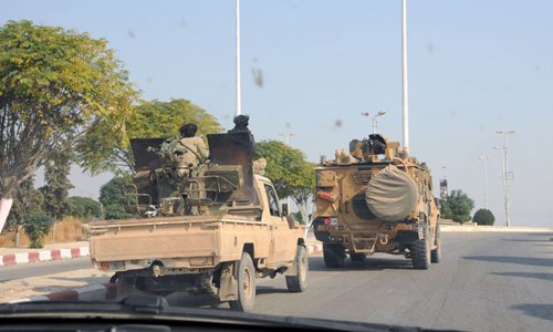 Members of the Turkish forces and allied Syrian rebels patrol in Tel Abyad, Syria. (Xinhua)