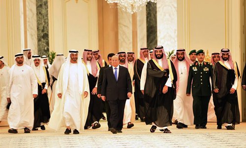 Yemeni President Abd-Rabbu Mansour Hadi (C, front) is accompanied by Saudi Crown Prince Mohammed bin Salman Al Saud (R, front), Abu Dhabi Crown Prince Sheikh Mohammed bin Zayed Al Nahyan (L, front) before signing an agreement in Riyadh, Saudi Arabia, on Nov. 5, 2019. The Yemeni UN-backed government and the Southern Transitional Council (STC) signed here on Tuesday a Saudi-sponsored "Riyadh Agreement," Al Arabiya TV reported. (Xinhua)