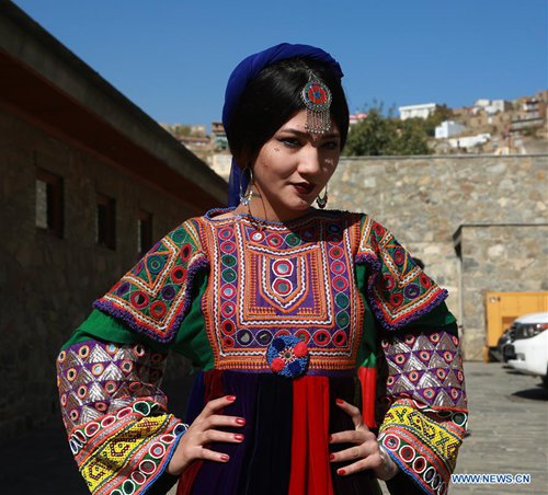 A model poses for photos after presenting costumes of ethnic people in Afghanistan during a fashion show in Kabul, capital of Afghanistan, Nov. 4, 2019. (Photo by Rahmatullah Alizadah/Xinhua)