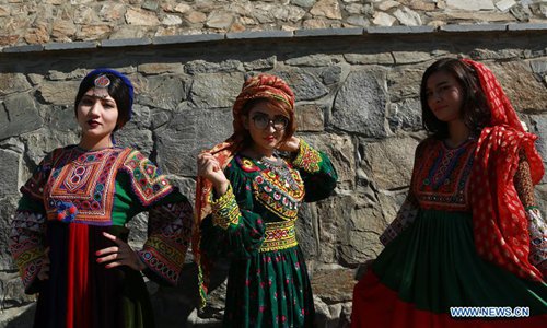 Models pose for photos after presenting costumes of ethnic people in Afghanistan during a fashion show in Kabul, capital of Afghanistan, Nov. 4, 2019. (Photo by Rahmatullah Alizadah/Xinhua)