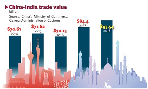 The bilateral trade volume between China and India was $95.54 billion in 2018, up 13.2 percent year-on-year, data from China's Ministry of Commerce showed.