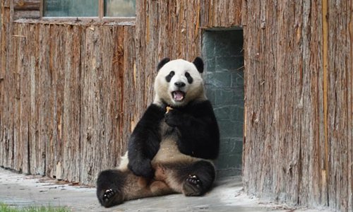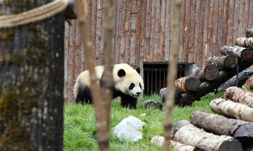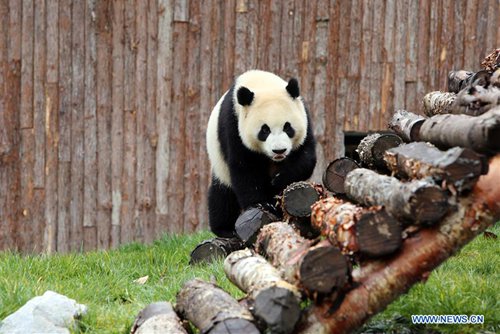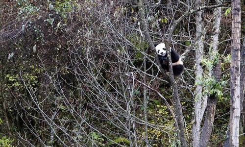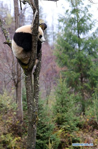 Giant panda Xin Xin is seen enjoying itself at the newly-opened Jiawuhai Giant Panda Conservation and Research Park in Jiuzhaigou County, the Aba Tibetan and Qiang Autonomous Prefecture, southwest China's Sichuan Province, Nov. 6, 2019. The Jiawuhai Giant Panda Conservation and Research Park officially opened here on Wednesday. The facility will serve as the new home for four giant pandas, namely Xin Xin, Tian Tian, Hai Hai and Xiao Liwu (meaning "Little Gift" in Chinese), which come from the China Conservation and Research Center for the Giant Panda. (Xinhua/Li Mengxin)