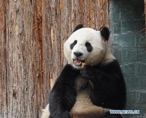 Giant panda Xiao Liwu is seen feeding itself at the newly-opened Jiawuhai Giant Panda Conservation and Research Park in Jiuzhaigou County, the Aba Tibetan and Qiang Autonomous Prefecture, southwest China's Sichuan Province, Nov. 6, 2019. The Jiawuhai Giant Panda Conservation and Research Park officially opened here on Wednesday. The facility will serve as the new home for four giant pandas, namely Xin Xin, Tian Tian, Hai Hai and Xiao Liwu (meaning "Little Gift" in Chinese), which come from the China Conservation and Research Center for the Giant Panda. (Photo by Chen Juwei/Xinhua)