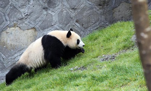 Giant panda Xin Xin is seen crawling at the newly-opened Jiawuhai Giant Panda Conservation and Research Park in Jiuzhaigou County, the Aba Tibetan and Qiang Autonomous Prefecture, southwest China's Sichuan Province, Nov. 6, 2019. The Jiawuhai Giant Panda Conservation and Research Park officially opened here on Wednesday. The facility will serve as the new home for four giant pandas, namely Xin Xin, Tian Tian, Hai Hai and Xiao Liwu (meaning "Little Gift" in Chinese), which come from the China Conservation and Research Center for the Giant Panda. (Xinhua/Li Mengxin)