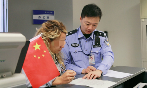 Tasiia(left) goes through the legal process relating to her offense, guided by an entry-exit police officer at Shanghai Pudong International Airport. Photo: Courtesy of Zhang Bo
