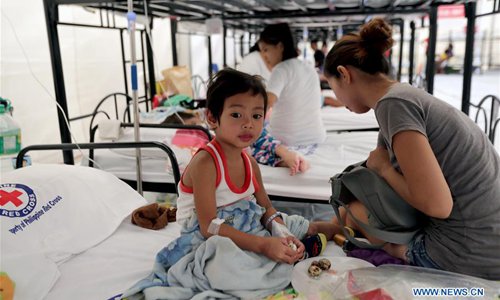 Dengue patients rest at a Dengue Emergency Medical Unit set up by the Philippine Red Cross in Cavite Province, the Philippines, Aug. 13, 2019. On Aug. 6, the Philippines's Department of Health (DOH) declared the dengue outbreak a national epidemic after a surge of dengue cases and deaths in the country. The department has recorded some 146,000 cases of dengue from January through July 20 this year, 98 percent more than the same period in 2018. The outbreak has caused 622 deaths, it added. (Xinhua/Rouelle Umali)