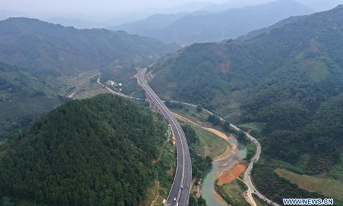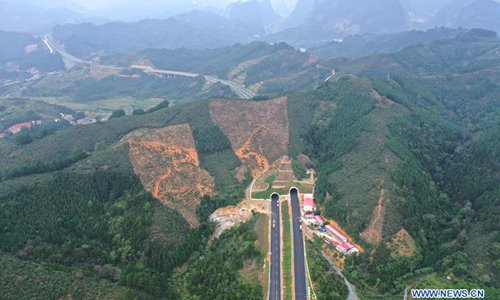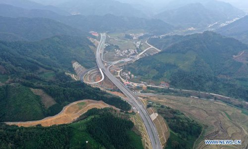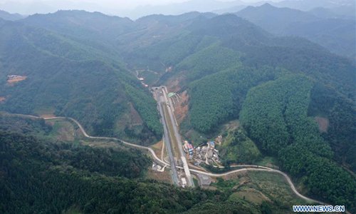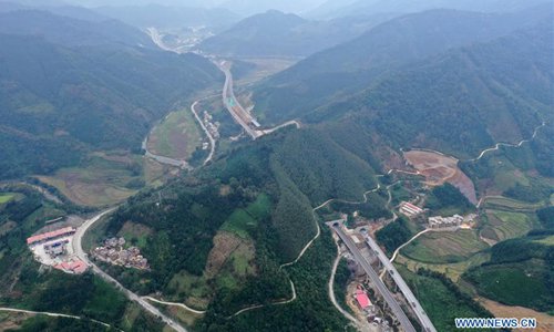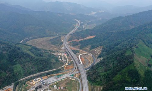 Aerial photo taken on Nov. 6, 2019 shows a view of Leye-Baise Highway in south China's Guangxi Zhuang Autonomous Region. According to Leye-Baise Highway construction headquarters, the main part of the highway linking Leye County and Baise City is almost completed and will be qualified to open by the end of the year. The completion of the highway will end the history of zero highway between the two regions, and bring traffic convenience to local people.Photo:Xinhua