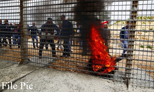 Palestinian protesters burn tires near the Israeli fence during a protest to mark the Land Day in the West Bank town of Beit Jala near Bethlehem, on March 30, 2017. (Xinhua/Luay Sababa)