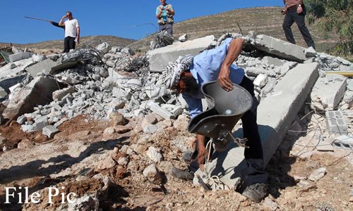 A Palestinian man holds a damaged loudspeaker belonging to a mosque after it was demolished by Israeli bulldozers in Khirbet Al-Taweel village near the West Bank city of Nablus, on April 29, 2014. (Xinhua/Ayman Nobani)