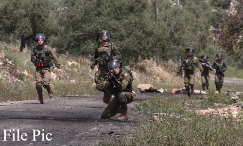 Israeli soldiers react during clashes with Palestinian protesters after a protest against the expanding of Jewish settlements in Kufr Qadoom village near the West Bank city of Nablus, on April 26, 2019. (Xinhua/Nidal Eshtayeh)