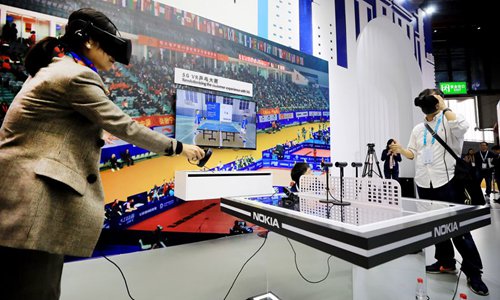 Visitors experience 5G VR table tennis simulators at the Equipment exhibition area during the second China International Import Expo (CIIE) in Shanghai, east China, Nov. 7, 2019. (Xinhua/Fang Zhe)