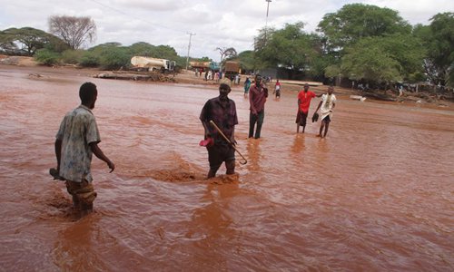 Residents struggle to cross the Modogashe seasonal river after it busted its banks due to heavy rains in Wajir, northern Kenya, Apr. 27, 2019. (Xinhua/Allan Mutiso)