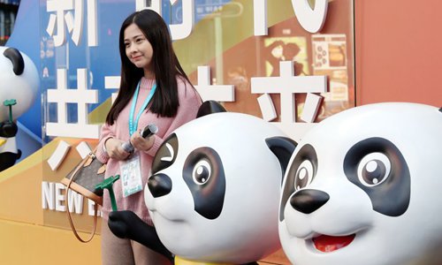 A visitor poses for photos with Jinbao, mascot of the China International Import Expo (CIIE), during the second CIIE in Shanghai, east China, Nov. 8, 2019. (Xinhua/Liu Ying)
