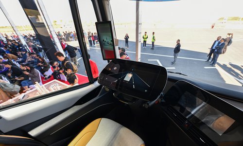 A smart driverless truck developed by SAIC Motor conducts test operations at Shanghai's Port of Yangshan in a 5G wireless technology environment. Realizing level 4 autonomous-driving operations, the trucks are set to facilitate smart driving at Yangshan, one of the world's top ports. Photo: VCG