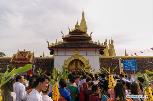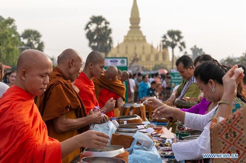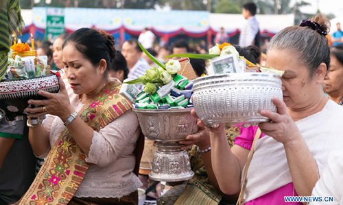 People attend the almsgiving activity around the That Luang Stupa in Vientiane, capital of Laos, Nov. 11, 2019. Considered as the most important religious festival in Laos, the That Luang Festival, which falls from Nov. 5 to Nov. 11 this year, concluded on Monday with a mass almsgiving activity held in and around the That Luang Stupa in Vientiane. (Photo by Kaikeo Saiyasane/Xinhua)