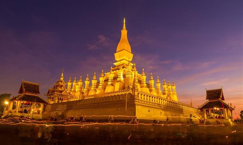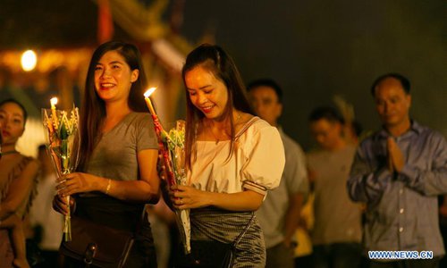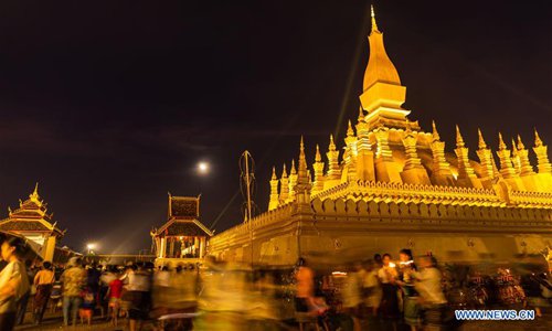 People take part in a candlelight parade surrounding the That Luang during the That Luang Festival in Vientiane, Laos, Nov. 11, 2019. The That Luang Festival, the most important religious festival in Laos, concluded on Nov. 11 with lots of people holding a candlelight parade surrounding the That Luang in Vientiane. (Photo by Kaikeo Saiyasane/Xinhua)