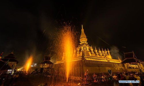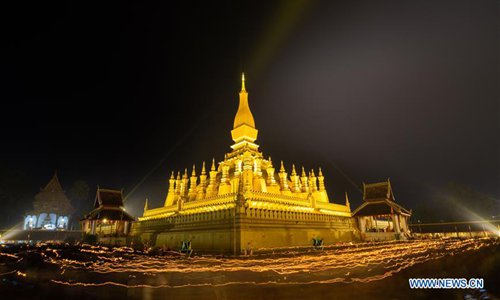 Photo taken at the night of Nov. 11, 2019 shows the view of the candlelight parade surrounding the That Luang during the That Luang Festival in Vientiane, Laos. The That Luang Festival, the most important religious festival in Laos, concluded on Nov. 11 with lots of people holding a candlelight parade surrounding the That Luang in Vientiane. (Photo by Kaikeo Saiyasane/Xinhua)