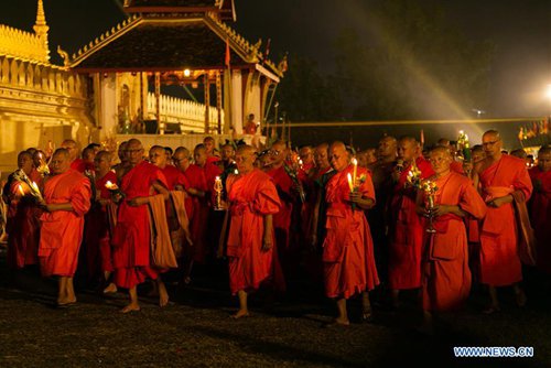 Photo taken at the night of Nov. 11, 2019 shows monks in the candlelight parade surrounding the That Luang during the That Luang Festival in Vientiane, Laos. The That Luang Festival, the most important religious festival in Laos, concluded on Nov. 11 with lots of people holding a candlelight parade surrounding the That Luang in Vientiane. (Photo by Kaikeo Saiyasane/Xinhua)