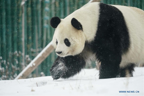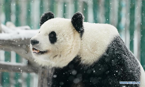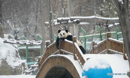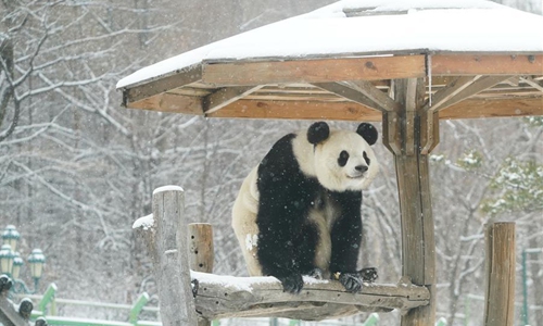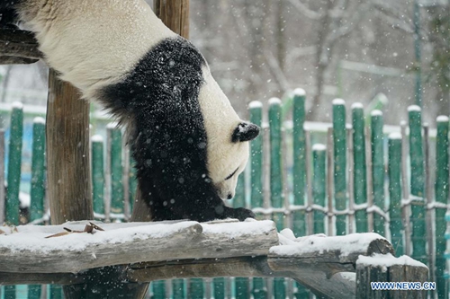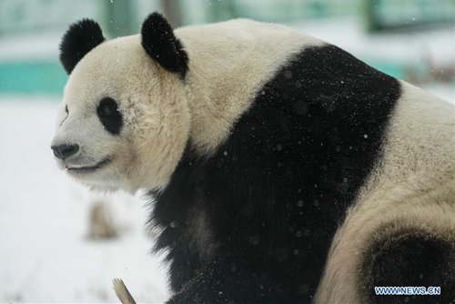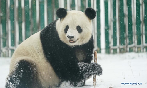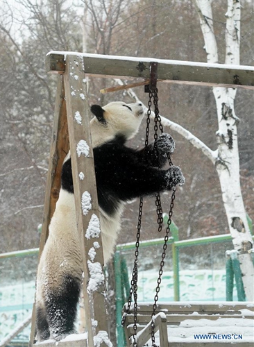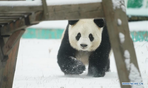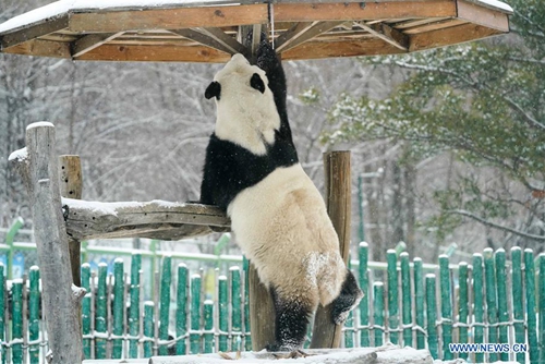 Giant panda Sijia plays in a snow-covered pavilion outside the panda house in the ski resort of Yabuli in Shangzhi County, northeast China's Heilongjiang Province, Nov. 13, 2019. A snowfall hit part of Heilongjiang on Wednesday. Giant panda Sijia was born at the China Conservation and Research Center for the Giant Panda in Wolong of southwest China's Sichuan Province on Aug. 12, 2006 and has been living in Yabuli since July 5, 2016. (Xinhua/Wang Song)