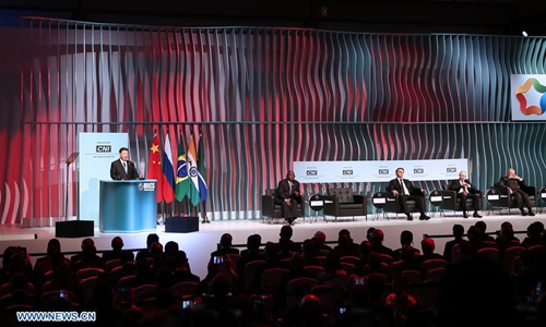 Chinese President Xi Jinping speaks at the closing ceremony of the BRICS business forum in Brasilia, Brazil, Nov. 13, 2019. Brazilian President Jair Bolsonaro, Russian President Vladimir Putin, Indian Prime Minister Narendra Modi and South African President Cyril Ramaphosa attended the closing ceremony. (Xinhua/Lan Hongguang)