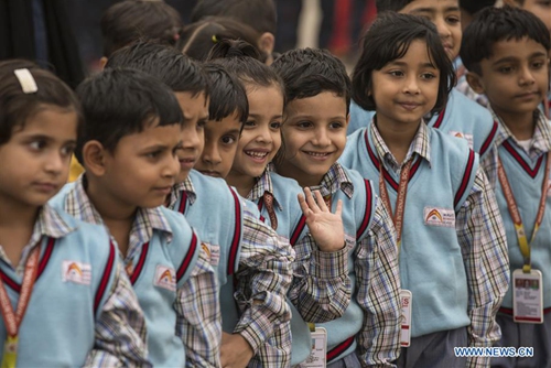 School children pose for photos on Children's Day in New Delhi, India, on Nov. 14, 2019. Children's Day is celebrated on Nov. 14 across India for awareness of children's rights. (Xinhua/Javed Dar)