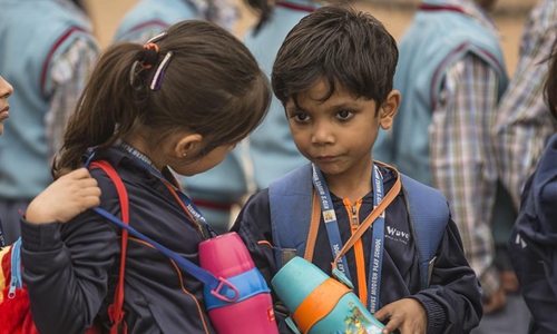 School children talk to each other on Children's Day in New Delhi, India, on Nov. 14, 2019. Children's Day is celebrated on Nov. 14 across India for awareness of children's rights. (Xinhua/Javed Dar)