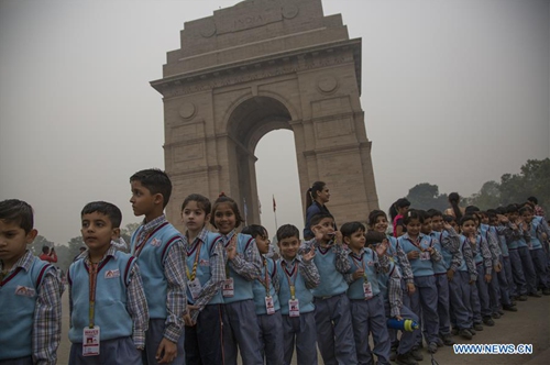 School children are seen in front of the India Gate on Children's Day in New Delhi, India, on Nov. 14, 2019. Children's Day is celebrated on Nov. 14 across India for awareness of children's rights. (Xinhua/Javed Dar)