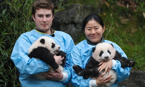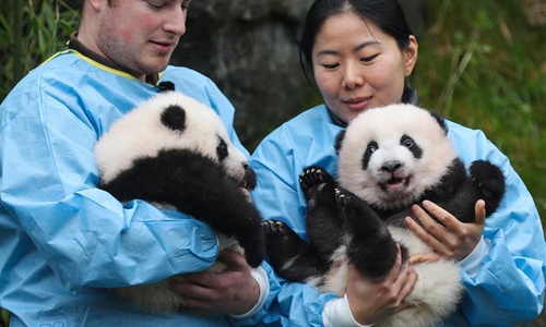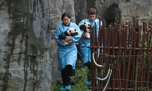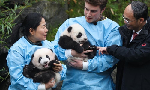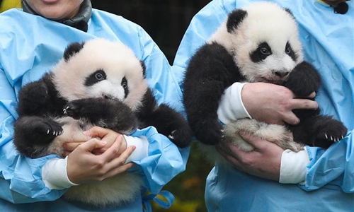 Zookeepers hold the panda twins "Bao Di" (R) and "Bao Mei" at the Pairi Daiza zoo in Brugelette, Belgium, Nov. 14, 2019. The giant panda twins who were given birth in August by giant panda Hao Hao, were given official names on their 100-day celebration on Thursday. The male cub was named as "Bao Di" and the female cub was named as "Bao Mei". Hao Hao was loaned by the Chinese government to Belgium in 2014. The pair of giant panda cubs were the second and third cubs born in the Pairi Daiza zoo, following the June 2016 birth of Tian Bao, the first giant panda ever born in the European country. Photo:Xinhua