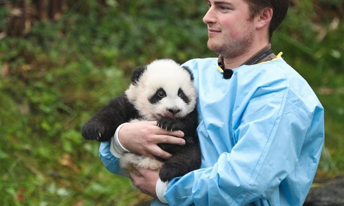 A zookeeper holds the panda "Bao Mei" at the Pairi Daiza zoo in Brugelette, Belgium, Nov. 14, 2019. The giant panda twins who were given birth in August by giant panda Hao Hao, were given official names on their 100-day celebration on Thursday. The male cub was named as "Bao Di" and the female cub was named as "Bao Mei". Hao Hao was loaned by the Chinese government to Belgium in 2014. The pair of giant panda cubs were the second and third cubs born in the Pairi Daiza zoo, following the June 2016 birth of Tian Bao, the first giant panda ever born in the European country. Photo:Xinhua