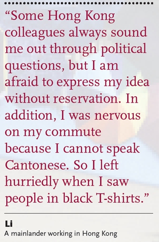 "Some Hong Kong colleagues always sound me out through political questions, but I am afraid to express my idea without reservation. In addition, I was nervous on my commute because I cannot speak Cantonese. So I left hurriedly when I saw people in black T-shirts," Li said.