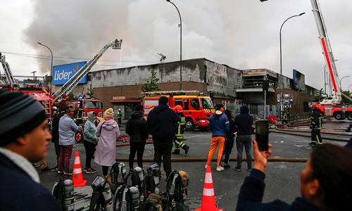 Firefighters extinguish the fire of a supermarket in Santiago, on October 20, 2019. Three people died in a fire in a supermarket being ransacked in the Chilean capital, as protests sparked by anger over social and economic conditions rocked one of Latin America's most stable countries. Photo: VCG