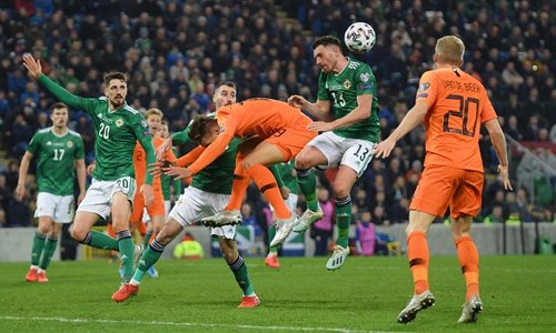 Luuk de Jong (center) of the Netherlands collides with Corry Evans of Northern Ireland on Saturday in Belfast, Northern Ireland. Photo: VCG