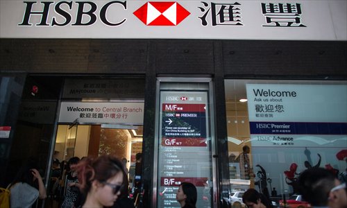 Pedestrians walk past an HSBC bank branch in Hong Kong on May 4. HSBC said Tuesday it would cut its global headcount by up to 50,000 as part of a restructuring that entails its withdrawal from Brazil and Turkey. Photo: CFP