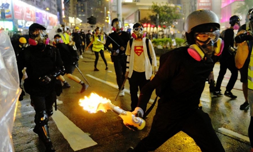 A rioter is about to throw a Molotov cocktail at the police in Causeway Bay of Hong Kong, August 31, 2019. Photo: Xinhua