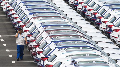 A staff member examines vehicles made by FAW-Volkswagen Automobile Co., Ltd. in Changchun, northeast China's Jilin Province, July 9, 2019. (Photo: Xinhua)