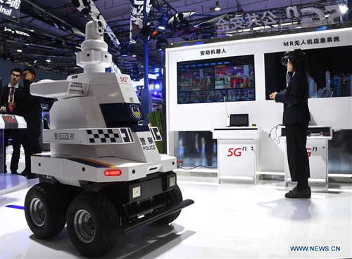 An exhibitor shows a security robot during a press preview for the 2019 World 5G Convention in Beijing, capital of China, Nov. 20, 2019. The 2019 World 5G Convention will open on Nov. 21. (Xinhua/Ren Chao)