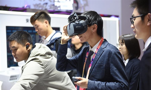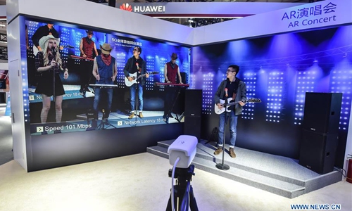 A visitor joins an AR (augmented reality) concert during a press preview for the 2019 World 5G Convention in Beijing, capital of China, Nov. 20, 2019. The 2019 World 5G Convention will open on Nov. 21. (Xinhua/Peng Ziyang)