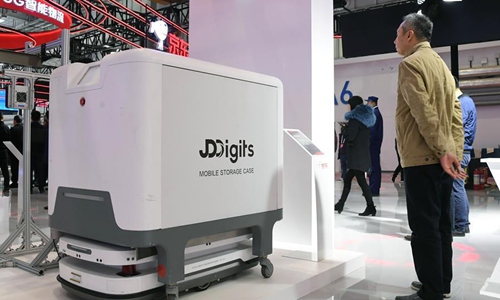 A visitor looks at an indoor delivery robot during a press preview for the 2019 World 5G Convention in Beijing, capital of China, Nov. 20, 2019. The 2019 World 5G Convention will open on Nov. 21. (Xinhua/Ren Chao)