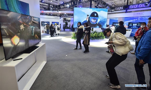Exhibitors display 5G-powered technologies during a press preview for the 2019 World 5G Convention in Beijing, capital of China, Nov. 20, 2019. The 2019 World 5G Convention will open on Nov. 21. (Xinhua/Li Xin)