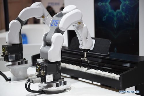 Two robotic arms play the piano during a press preview for the 2019 World 5G Convention in Beijing, capital of China, Nov. 20, 2019. The 2019 World 5G Convention will open on Nov. 21. (Xinhua/Chen Zhonghao)