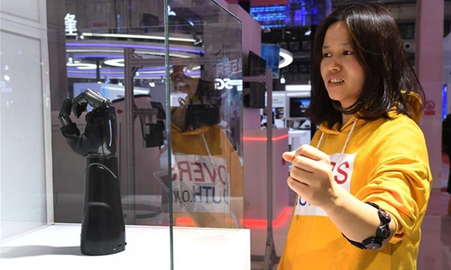 An exhibitor tests a wearable bionic hand during a press preview for the 2019 World 5G Convention in Beijing, capital of China, Nov. 20, 2019. The 2019 World 5G Convention will open on Nov. 21. (Xinhua/Ren Chao)