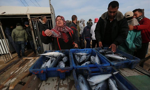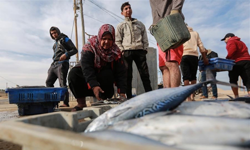 Palestinian Nadira Rashad Al-Quraan (L, front) sells fish at a market in Deir al-Balah, central Gaza Strip, Nov. 21, 2019. (Photo by Mohammed Dahman/Xinhua)