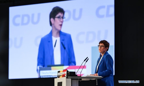 Germany's Defense Minister and Christian Democratic Union (CDU) party leader Annegret Kramp-Karrenbauer delivers a speech during the party's convention in Leipzig, Germany, Nov. 22, 2019. (Xinhua/Shan Yuqi)