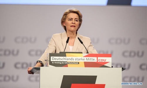 President-elect of European Commission Ursula von der Leyen delivers a speech during the convention of Germany's Christian Democratic Union (CDU) party in Leipzig, Germany, Nov. 22, 2019. (Xinhua/Shan Yuqi)