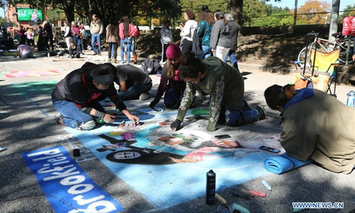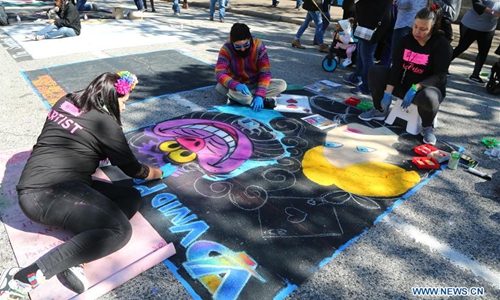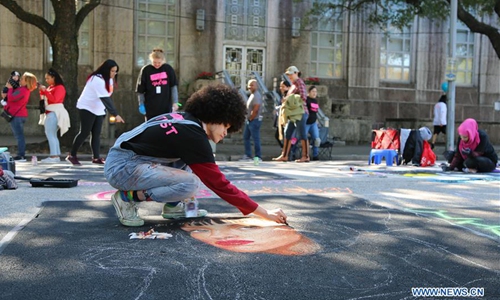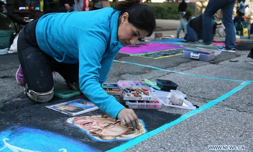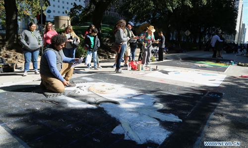 An artist draws street paintings in Houston, Texas, the United States, on Nov. 23, 2019. More than 200 artists took part in this year's Houston Via Colori, one of the largest art festivals in the city, which is held to raise money for hearing-impaired children. (Photo by Qiu Ma/Xinhua)