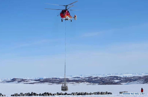 The helicopter unloads cargos from China's polar icebreaker Xuelong in the waters in Antarctica, Nov. 23, 2019. (Xinhua/Liu Shiping)