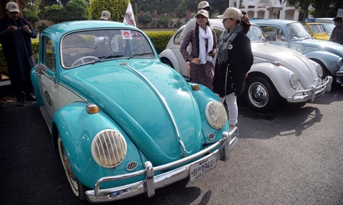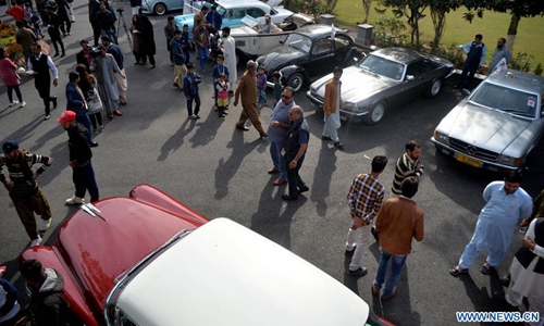 Visitors watch vintage cars at Vintage Classic Car Rally 2019 in northwest Pakistan's Peshawar on Nov. 24, 2019. The event took place here on Sunday, displaying more than 50 vehicles. (Photo by Umar Qayyum/Xinhua)