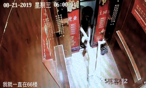 While lying on the ground, she holds the elevator door open with one leg. "I knew he would beat me after dragging me out of the elevator, so I was terrified and struggled," she said.