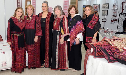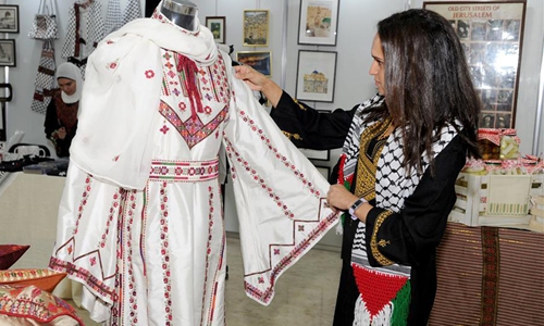 Exhibitors show traditional Palestinian costumes to visitors at a Palestinian cultural exhibition in Kuwait City, Kuwait, Nov. 25, 2019. A Palestinian cultural exhibition organized by Kuwaiti National Council for Culture, Arts and Letters (NCCAL) was held here on Monday, showcasing Palestinian embroidery, ceramic, wooden artworks and popular folk food. The exhibition will last until Nov. 28. (Photo by Ghazy Qaffaf/Xinhua)