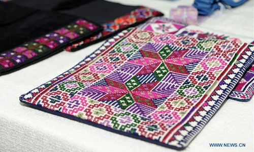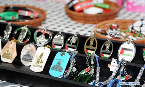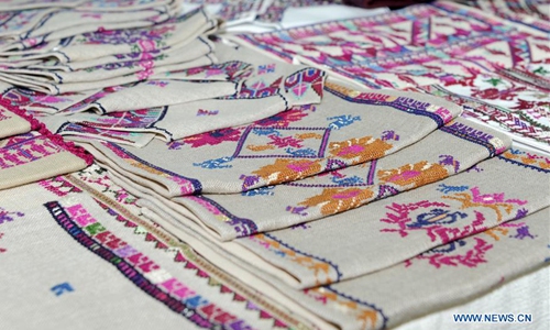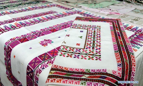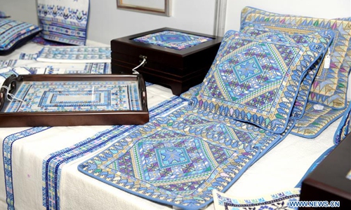 Exhibits are seen at a Palestinian cultural exhibition in Kuwait City, Kuwait, Nov. 25, 2019. A Palestinian cultural exhibition organized by Kuwaiti National Council for Culture, Arts and Letters (NCCAL) was held here on Monday, showcasing Palestinian embroidery, ceramic, wooden artworks and popular folk food. The exhibition will last until Nov. 28. (Photo by Ghazy Qaffaf/Xinhua)